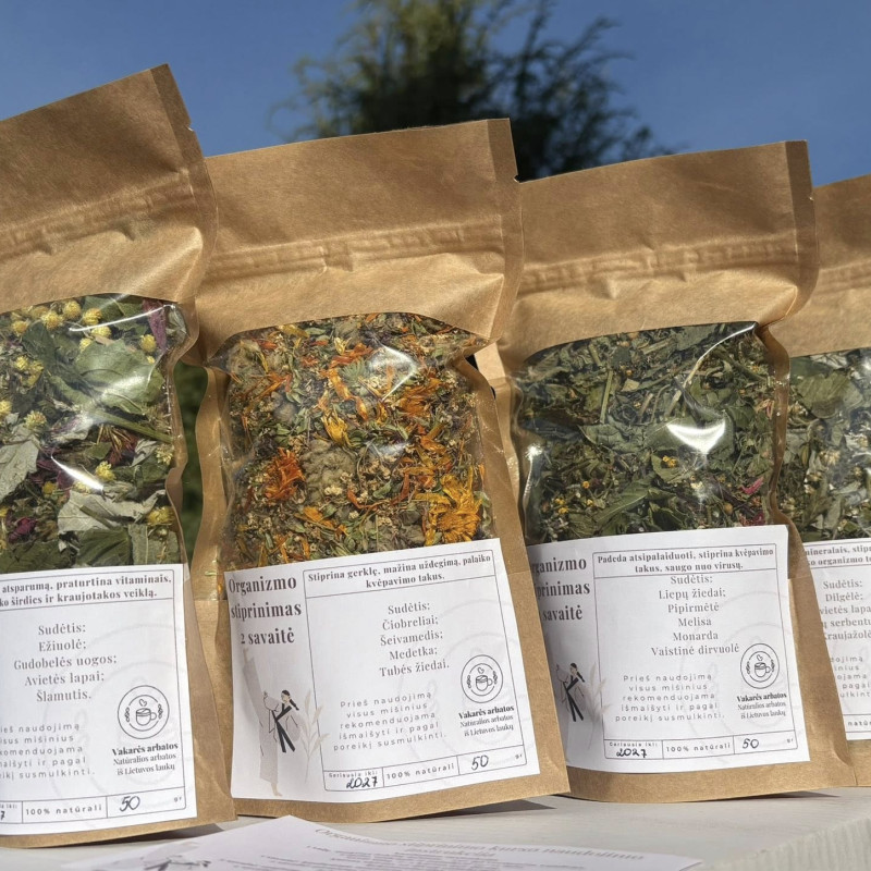 Rinkinį sudaro 4 arbatos po 50 gr. Rinkinio kaina 20 eur. Rinkinio 4 asmenų šeimai užtenka apie mėnesį laiko.