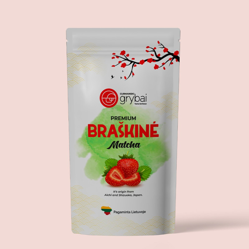 Natūralus braškių papildymas. Premium matcha sujungta su liofilizuotais braškių milteliais – tai leidžia atrasti naują skonio patirtį, kur tradicinė japoniška arbata susilieja su gaivia, natūralia uogų nata.