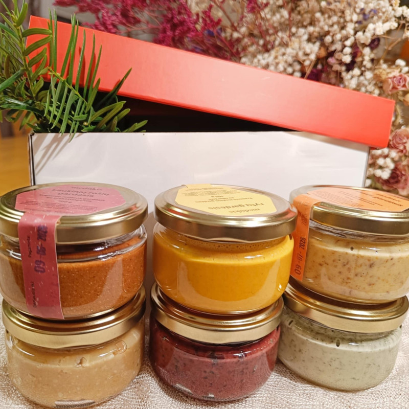 Visi kreminio medaus gardėsiai mažuose stiklainėliuose (po 100 g) sutilpo į baltą dėžutę su raudonu dangteliu.