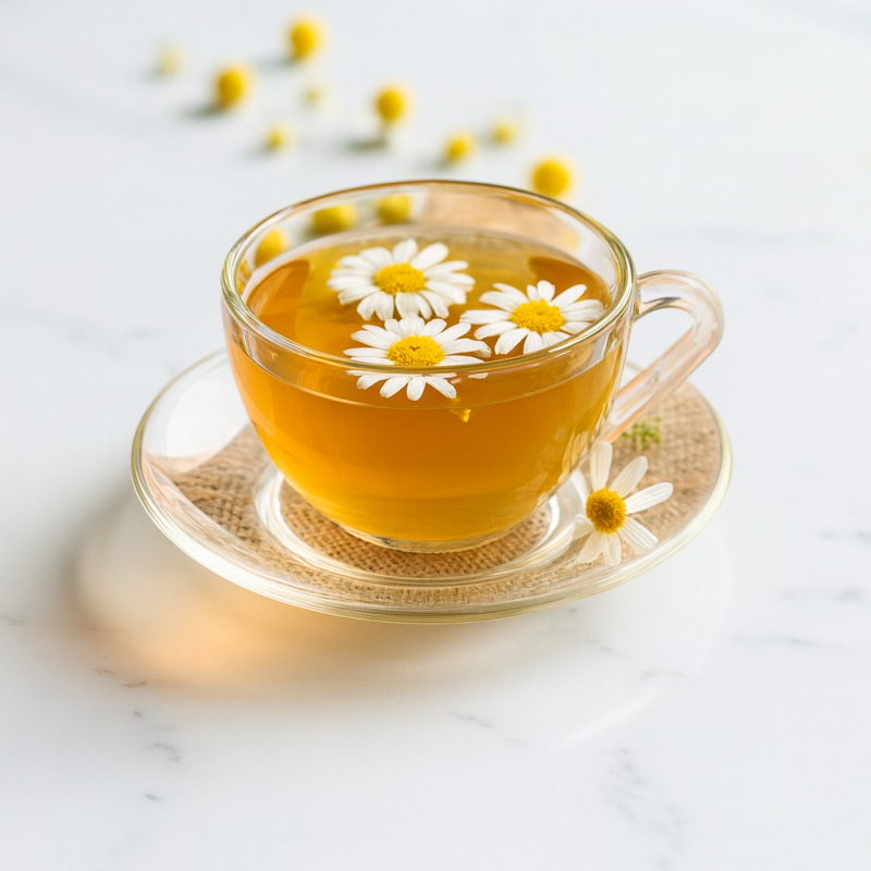 1–2 arbatinius šaukštelius ramunėlių žiedų užpilkite 200 ml verdančio vandens.