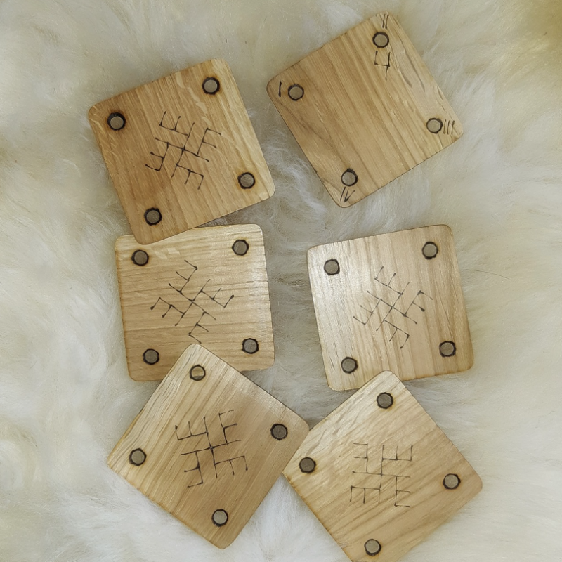 Mediniai (klevo, ąžuolo arba uosio) vytinių juostų audimo įrankiai (6x6 cm), numeruoti, numeruotomis skylutėmis.