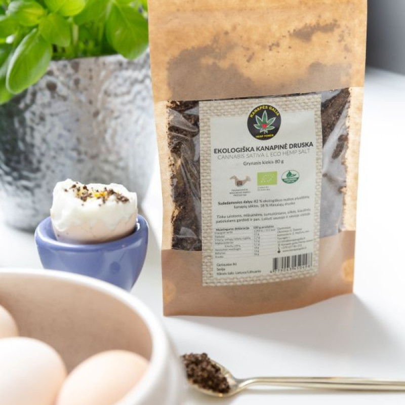 Sudedamosios dalys: 82 % ekologiškos maltos pluoštinių kanapių sėklos, 18 % Himalajų druska.
