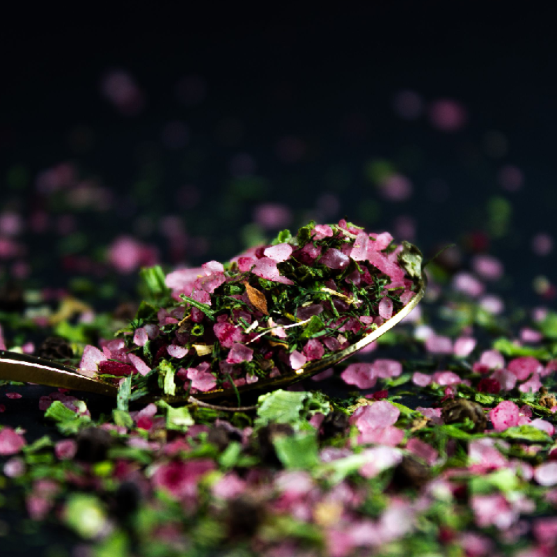 Sudedamosios dalys: jūros druska 80 %, juodieji pipirai, krapai, česnakų laiškai, burokėlių milteliai, svogūnų laiškai, bazilikai, prieskonių ekstraktas, kvapioji medžiaga, augalinis aliejus (rapsų ).