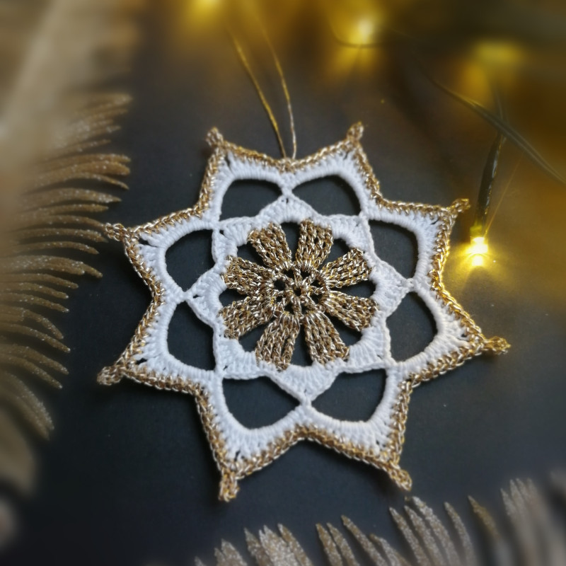 Rankų darbo nerta medvilninė snaigė. Dekoruota aukso spalvos metalizuotu siūlu. Skersmuo - 10 cm.