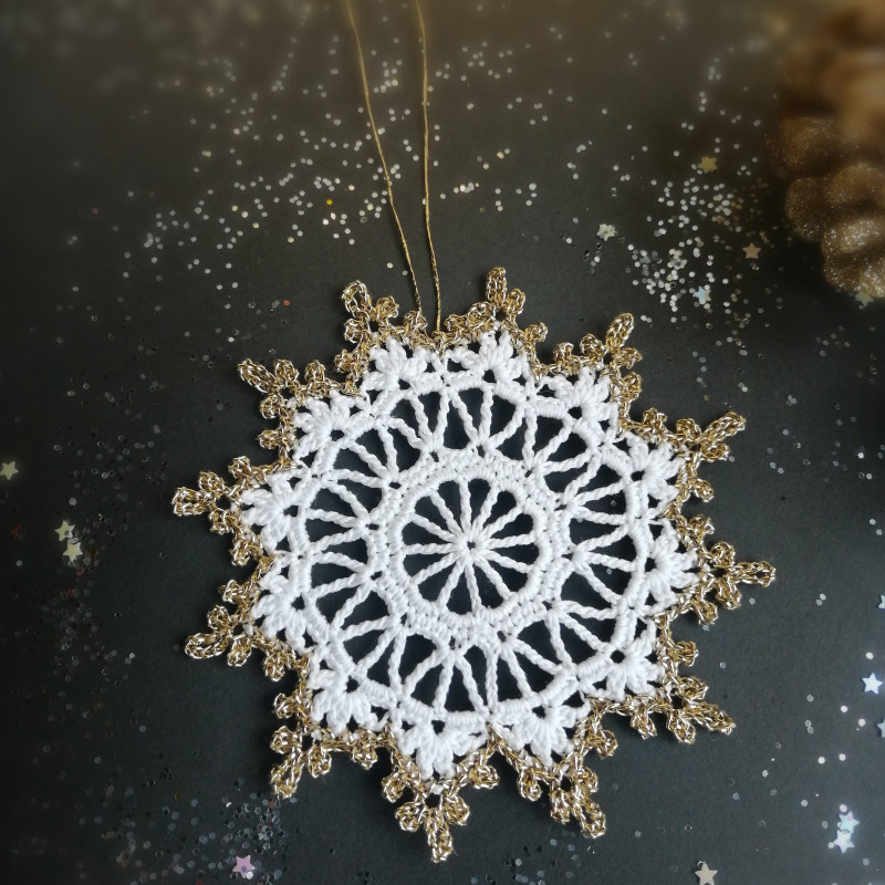 Rankų darbo nerta medvilninė snaigė.  Dekoruota aukso spalvos metalizuotu siūlu. Skersmuo - 12 cm.