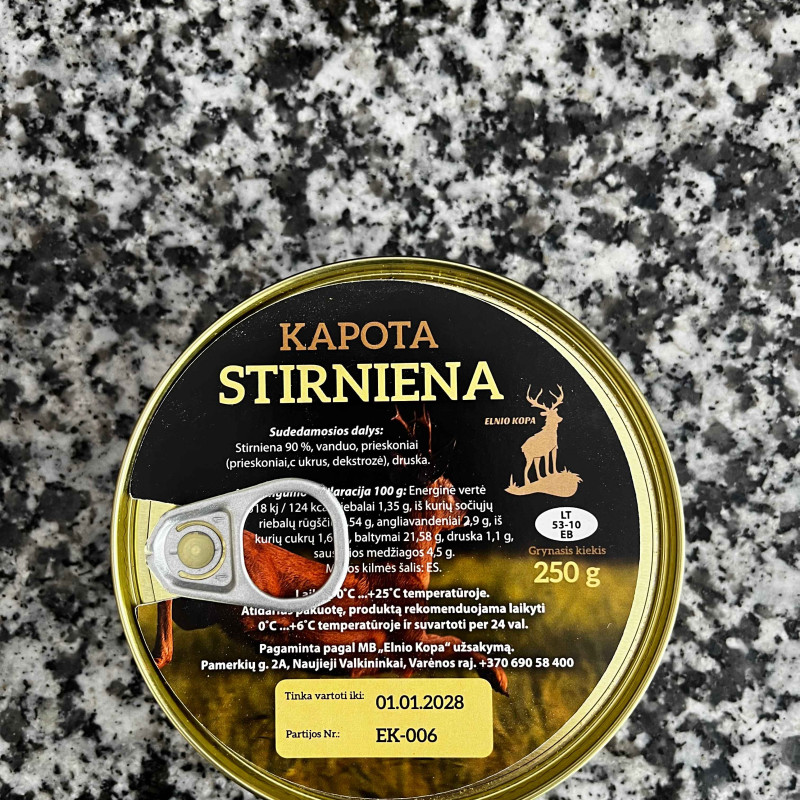 Kapota stirnienos mėsa, maišyta su kiaulienos lašinukais.